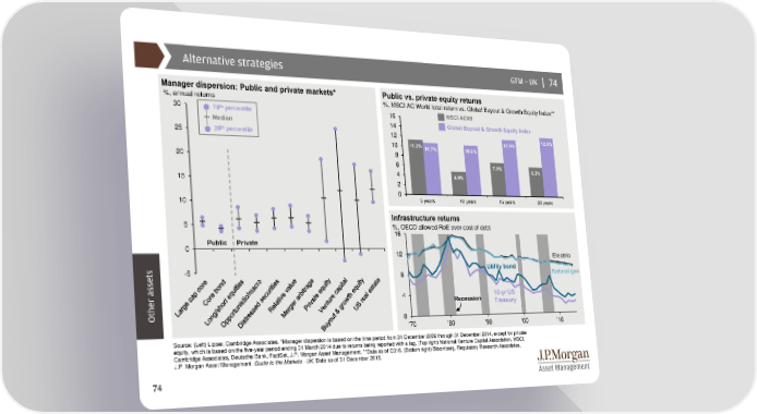 Alternative strategies GTM –UK | 74 Manager dispersion: Public and private markets* Public vs. private equity returns %, annual returns %, MSCI AC World total return vs. Global Buyout & Growth Equity Index** 30 th 16 MSCI ACWI 75 percentile Median 14 Global Buyout & Growth Equity Index 25 25th percentile 12 12.8% 10 11.2% 12.0% 10.7% 10.5% 20 8 6 7.0% 6.3% 15 4 4.9% 2 0 10 5 years 10 years 15 years 20 years Infrastructure returns 5 %, OECD allowed RoEover cost of debt 16 0 Public Private 12 Electric -5 Utility bond Natural gas 8 4 Recession 10-yr US Other assets Treasury 0 '70 '80 '90 '00 '10 Source: (Left) Lipper, Cambridge Associates. *Manager dispersion is based on the time period from 31 December 2009 through 31 December 2014, except for private equity, which is based on the five-year period ending 31 March 2014 due to returns being reported with a lag. (Top right) National Venture Capital Association, MSCI, Cambridge Associates, Deutsche Bank, FactSet, J.P. Morgan Asset Management. **Data as of Q316. (Bottom right) Bloomberg, Regulatory Research Associates, J.P. Morgan Asset Management. Guide to the Markets - UK. Data as of 31 December 2016. 74