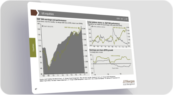 US equities GTM –UK | 47 S&P 500 earnings and performance Initial jobless claims vs. S&P 500 performance Index level, next 12 months’ earnings estimates (LHS); index level (RHS) Thousands, four-week moving average (LHS); index level (RHS) 140 Initial jobless claims S&P 500 index level S&P 500 EPS S&P 500 index level 2,200 130 2,000 120 1,800 110 s 1,600 e 100 i t i u Earnings per share (EPS) growth Eq 90 1,400 % change year on year 1,200 20 Index ex-energy 80 10 70 1,000 0 60 800 -10 Total index 50 600 -20 '08 '09 '10 '11 '12 '13 '14 '15 '16 '17 '14 '15 '16 Source: (Left) FactSet, Standard & Poor’s, J.P. Morgan Asset Management. (Top right) BLS, FactSet, Standard & Poor’s, J.P. Morgan Asset Management. (Bottom right) MSCI, Thomson Reuters Datastream, J.P. Morgan Asset Management. Index is MSCI USA. Guide to the Markets - UK. Data as of 31 December 2016. 47