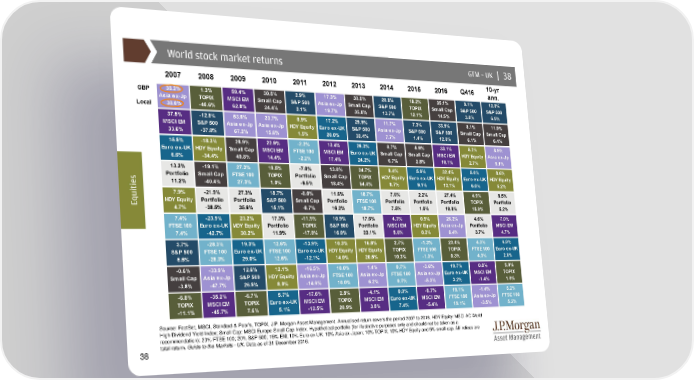 World stock market returns GTM–UK | 38 2007 2008 2009 2010 2011 2012 2013 2014 2015 2016 Q416 10-yr ann. GBP 38.2% 1.3% 59.4% 30.5% 2.9% 17.3% 30.5% 20.8% 18.2% 35.1% 9.1% 12.0% Asia ex-Jp TOPIX MSCI EM Small Cap S&P 500 Asia ex-Jp Small Cap S&P 500 TOPIX Small Cap S&P 500 S&P 500 Local 38.0% -40.6% 62.8% 24.4% 2.1% 19.7% 35.8% 13.7% 12.1% 14.5% 3.8% 6.9% 37.5% -12.8% 53.6% 23.7% 0.9% 17.2% 29.9% 11.7% 7.3% 33.5% 8.1% 11.0% MSCI EM S&P 500 Asia ex-Jp Asia ex-Jp HDY Equity Euro ex-UK S&P 500 Asia ex-Jp S&P 500 S&P 500 Small Cap Small Cap 33.6% -37.0% 67.2% 15.6% 1.5% 20.0% 32.4% 7.7% 1.4% 12.0% 6.1% 6.4% 15.5% -18.3% 28.9% 22.9% -2.2% 13.4% 26.3% 8.7% 5.9% 33.1% 5.2% 8.9% Euro ex-UK HDY Equity Small Cap MSCI EM FTSE 100 MSCI EM Euro ex-UK Small Cap Small Cap MSCI EM HDY Equity Asia ex-Jp 6.6% -34.4% 40.8% 14.4% -2.2% 17.4% 24.2% 6.7% 2.8% 10.1% 2.7% 5.1% 13.3% -19.1% 27.3% 19.5% -7.0% 13.0% 24.7% 8.4% 5.9% 32.4% 5.0% 8.6% s Portfolio Small Cap FTSE 100 TOPIX Portfolio Small Cap TOPIX HDY Equity Euro ex-UK HDY Equity Euro ex-UK HDY Equity e 11.2% -40.4% 27.3% 1.0% -6.5% 18.4% 54.4% 8.7% 9.1% 13.1% 6.0% 5.2% i t i 7.9% -21.9% 27.3% 18.7% -8.0% 11.6% 18.7% 7.6% 2.2% 27.4% 4.9% 8.5% u Eq HDY Equity Portfolio Portfolio S&P 500 Small Cap Portfolio FTSE 100 Portfolio Portfolio Portfolio TOPIX Portfolio 4.7% -38.5% 35.6% 15.1% -8.7% 16.2% 18.7% 7.5% 1.0% 10.8% 15.0% 5.2% 7.4% -23.9% 23.2% 17.3% -11.9% 10.9% 17.6% 4.3% 0.9% 26.2% 4.6% 7.0% FTSE 100 Euro ex-UK HDY Equity Portfolio TOPIX S&P 500 Portfolio MSCI EM HDY Equity Asia ex-Jp Portfolio MSCI EM 7.4% -42.7% 30.2% 11.9% -17.0% 16.0% 23.1% 5.6% 0.2% 6.4% 3.7% 4.7% 3.7% -28.3% 19.3% 12.6% -13.9% 10.3% 16.8% 2.7% -1.3% 23.4% 4.3% 6.0% S&P 500 FTSE 100 Euro ex-UK FTSE 100 Euro ex-UK HDY Equity HDY Equity TOPIX FTSE 100 TOPIX FTSE 100 Euro ex-UK 5.5% -28.3% 29.0% 12.6% -12.1% 14.0% 20.5% 10.3% -1.3% 0.3% 4.3% 2.8% -0.6% -33.9% 12.6% 12.1% -16.5% 10.0% 1.4% 0.7% -3.6% 19.7% 0.8% 5.9% Small Cap Asia ex-Jp S&P 500 HDY Equity Asia ex-Jp FTSE 100 Asia ex-Jp FTSE 100 Asia ex-Jp Euro ex-UK MSCI EM TOPIX -3.8% -47.7% 26.5% 8.0% -14.6% 10.0% 6.2% 0.7% -5.3% 3.2% -1.4% 1.0% -6.8% -35.2% -6.7% 5.7% -17.6% 2.8% -4.1% 0.0% -9.7% 19.1% -1.4% 5.2% TOPIX MSCI EM TOPIX Euro ex-UK MSCI EM TOPIX MSCI EM Euro ex-UK MSCI EM FTSE 100 Asia ex-Jp FTSE 100 -11.1% -45.7% 7.6% 5.1% -12.5% 20.9% 3.8% 7.4% -5.4% 19.1% -3.5% 5.2% Source: FactSet, MSCI, Standard & Poor’s, TOPIX, J.P. Morgan Asset Management. Annualised return covers the period 2007 to 2016. HDY Equity: MSCI AC World High Dividend Yield Index; Small Cap: MSCI Europe Small Cap Index. Hypothetical portfolio (for illustrative purposes only and should not be taken as a recommendation): 20% FTSE 100; 20% S&P 500; 15% EM; 10% Euro ex-UK; 10% Asia ex-Japan; 10% TOPIX; 10% HDY Equity and 5% small cap. All indices are total return. Guide to the Markets - UK. Data as of 31 December 2016. 38