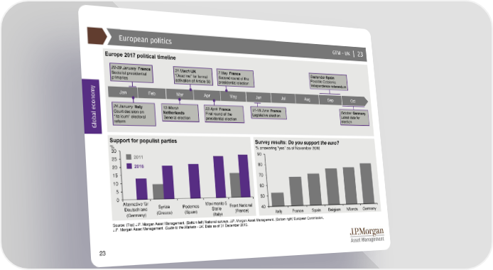 European politics GTM –UK | 23 Europe 2017 political timeline 22-29 January France 31 March UK 7 May France September Spain Socialist presidential “Deadline” for formal Second round of the Possible Catalonia primaries activation of Article 50 presidential election independence referendum y Jan Feb Mar Apr May Jun Jul Aug Sep Oct 24 January Italy 15 March 23 April France 11-18 June France October Germany Court decision on Netherlands First round of the Legislative election Latest date for “Italicum” electoral General election presidential election election Global economreform Support for populist parties Survey results: Do you support the euro? % % answering “yes” as of November 2016 30 90 25 2011 20 2016 80 15 70 10 60 5 0 50 Alternative für Syriza Podemos Movimento5 Front National Deutschland (Greece) (Spain) Stelle (France) 40 (Germany) (Italy) Italy France Spain Belgium N'lands Germany Source: (Top) J.P. Morgan Asset Management. (Bottom left) National surveys, J.P. Morgan Asset Management. (Bottom right) European Commission, J.P. Morgan Asset Management. Guide to the Markets - UK. Data as of 31 December 2016. 23