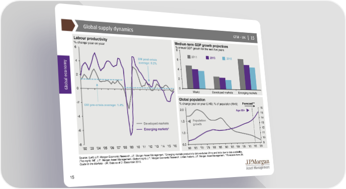 Global supply dynamics GTM –UK | 15 Labour productivity Medium-term GDP growth projections % change year on year % annual GDP growth for the next five years 6 8 2011 2013 2015 DM post-crisis 6 y 4 average: 0.2% 4 2 2 Global econom0 0 World Developed markets Emerging markets -2 Global population Forecast** DM pre-crisis average: 1.4% % change year on year (LHS); % of population (RHS) 2.0 Age 65+ 16 15 -4 14 Developed markets 1.5 Population 13 growth -6 Emerging markets* 12 1.0 11 -8 10 '02 '03 '04 '05 '06 '07 '08 '09 '10 '11 '12 '13 '14 '15 '16 0.5 9 '60 '65 '70 '75 '80 '85 '90 '95 '00 '05 '10 '15 '20 Source: (Left) J.P. Morgan Economic Research, J.P. Morgan Asset Management. *Emerging markets productivity data excludes China and India due to data availability. (Top right) IMF, J.P. Morgan Asset Management. (Bottom right) J.P. Morgan Economic Research, United Nations, J.P. Morgan Asset Management. **Forecasts from UN. Guide to the Markets - UK. Data as of 31 December 2016. 15