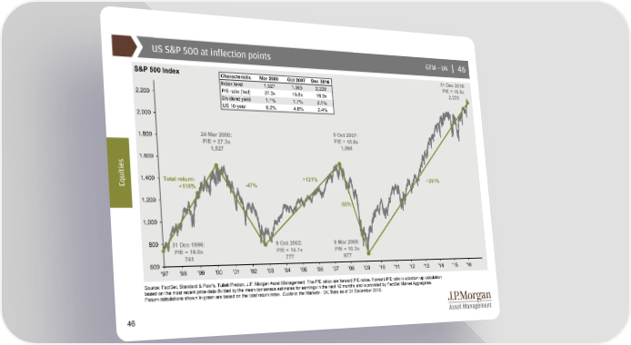 US S&P 500 at inflection points GTM –UK | 46 S&P 500 Index Characteristic Mar 2000 Oct 2007 Dec 2016 31 Dec 2016: Index level 1,527 1,565 2,239 P/E = 16.9x P/E ratio (fwd) 27.3x 15.8x 16.9x 2,239 2,200 Dividend yield 1.1% 1.7% 2.1% US 10-year 6.2% 4.6% 2.4% 2,000 1,800 24 Mar 2000: 9 Oct 2007: P/E = 27.3x P/E = 15.8x 1,527 1,565 s 1,600 e i t i u 1,400 Total return: +121% +291% Eq +116% -47% 1,200 -55% 1,000 800 31 Dec 1996: 9 Oct 2002: 9 Mar 2009: P/E = 16.0x P/E = 14.1x P/E = 10.3x 741 777 677 600 '97 '98 '99 '00 '01 '02 '03 '04 '05 '06 '07 '08 '09 '10 '11 '12 '13 '14 '15 '16 Source: FactSet, Standard & Poor’s, Tullett Prebon, J.P. Morgan Asset Management. The P/E ratios are forward P/E ratios. Forward P/E ratio is a bottom-up calculation based on the most recent price data divided by the mean consensus estimates for earnings in the next 12 months and is provided by FactSet Market Aggregates. Return calculations shown in green are based on the total return index. Guide to the Markets - UK. Data as of 31 December 2016. 46