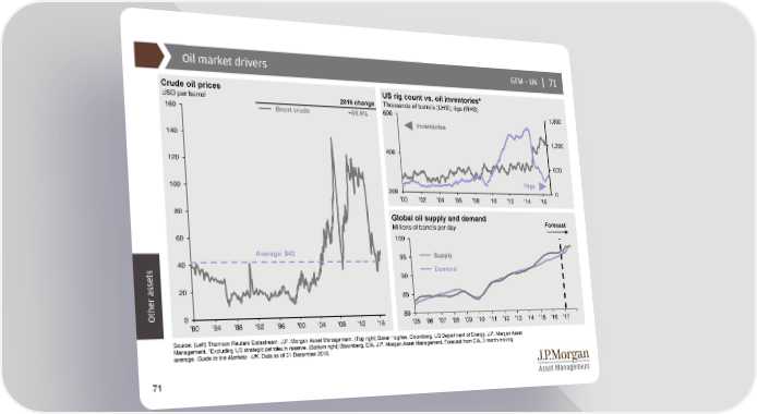 Oil market drivers GTM –UK | 71 Crude oil prices US rig count vs. oil inventories* USD per barrel 2016 change Thousands of barrels (LHS); rigs (RHS) 160 Brent crude +58.9% 600 1,800 Inventories 140 1,200 400 120 600 100 Rigs 200 0 '00 '02 '04 '06 '08 '10 '12 '14 '16 80 Global oil supply and demand Millions of barrels per day Forecast 60 100 Average: $42 95 Supply 40 Demand 90 20 85 Other assets0 80 '80 '84 '88 '92 '96 '00 '04 '08 '12 '16 '05 '06 '07 '08 '09 '10 '11 '12 '13 '14 '15 '16 '17 Source: (Left) Thomson Reuters Datastream, J.P. Morgan Asset Management. (Top right) Baker Hughes, Bloomberg, US Department of Energy, J.P. Morgan Asset Management. *Excluding US strategic petroleum reserve. (Bottom right) Bloomberg, EIA, J.P. Morgan Asset Management. Forecast from EIA, 3 month moving average. Guide to the Markets - UK. Data as of 31 December 2016. 71