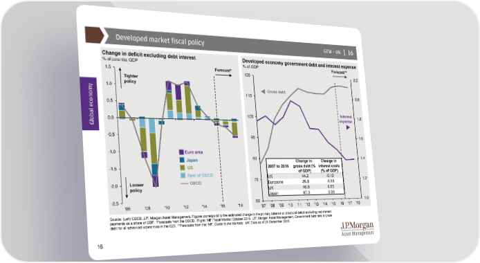 Developed market fiscal policy GTM –UK | 16 Change in deficit excluding debt interest Developed economy government debt and interest expense % of potential GDP % of GDP Forecast** 1.5 Forecast* 120 2.2 Tighter 1.0 policy y Gross debt 110 2.0 0.5 100 Interest 1.8 Global econom0.0 expense -0.5 90 1.6 -1.0 Euro area Japan 80 Change in Change in 1.4 -1.5 US 2007 to 2016 gross debt (% interest costs Rest of OECD of GDP) (% of GDP) 70 US 44.2 -0.12 1.2 -2.0 Looser OECD Eurozone 26.8 -0.58 policy UK 46.8 0.05 Japan 67.3 0.08 -2.5 60 1.0 '06 '08 '10 '12 '14 '16 '18 '07 '08 '09 '10 '11 '12 '13 '14 '15 '16 '17 '18 Source: (Left) OECD, J.P. Morgan Asset Management. Figures correspond to the estimated change in the primary balance or structural deficit excluding net interest payments as a share of GDP. *Forecasts from the OECD. (Right) IMF Fiscal Monitor October 2016, J.P. Morgan Asset Management. Government debt ratio is gross debt for all advanced economies in the G20. **Forecasts from the IMF. Guide to the Markets - UK. Data as of 31 December 2016. 16