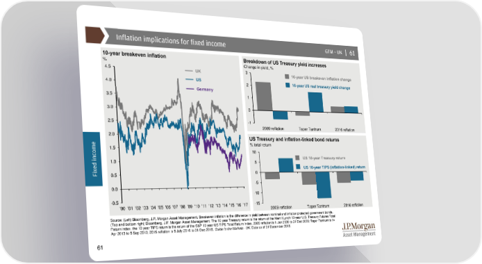 Inflation implications for fixed income GTM –UK | 61 10-year breakeven inflation Breakdown of US Treasury yield increases % Change in yield, % 4.5 UK 3 10-year US breakeven inflation change 4.0 US 2 10-year US real treasury yield change Germany 3.5 1 3.0 0 2.5 -1 2009 reflation Taper Tantrum 2016 reflation 2.0 US Treasury and inflation-linked bond returns e % total return m 1.5 o 10 c n US 10-year Treasury return i 1.0 5 d e US 10-year TIPS (inflation-linked) return x Fi 0.5 0 0.0 -5 -10 -0.5 -15 '00 '01 '02 '03 '04 '05 '06 '07 '08 '09 '10 '11 '12 '13 '14 '15 '16 '17 2009 reflation Taper Tantrum 2016 reflation Source: (Left) Bloomberg, J.P. Morgan Asset Management. Breakeven inflation is the difference in yield between nominal and inflation protected government bonds. (Top and bottom right) Bloomberg, J.P. Morgan Asset Management. The 10 year Treasury return is the return of the Merrill Lynch 10-year U.S. Treasury Futures Total Return index, the 10 year TIPS return is the return of the S&P 10 year US TIPS Total Return Index. 2009 reflation is 1 Jan 2009 to 31 Dec 2009; Taper Tantrum is 14 Apr 2013 to 5 Sep 2013; 2016 reflation is 8 July 2016 to 31 Dec 2016. Guide to the Markets - UK. Data as of 31 December 2016. 61