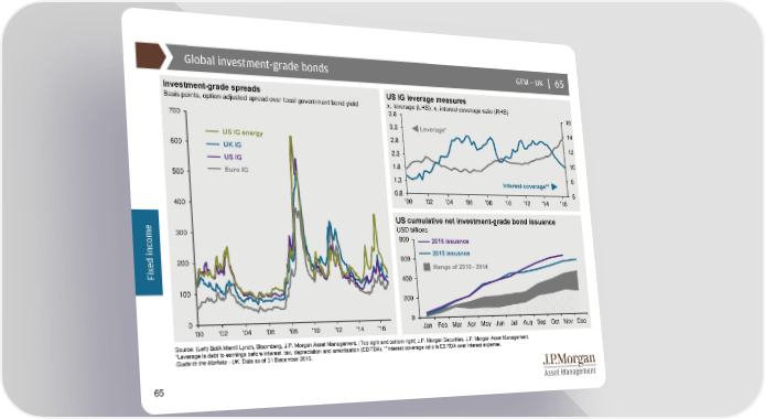 Global investment-grade bonds GTM –UK | 65 Investment-grade spreads US IG leverage measures Basis points, option-adjusted spread over local government bond yield x, leverage (LHS); x, interest coverage ratio (RHS) 3.8 16 700 3.3 Leverage* 14 US IG energy 2.8 12 600 UK IG 2.3 US IG 1.8 10 500 Euro IG 1.3 8 Interest coverage** 0.8 6 400 '00 '02 '04 '06 '08 '10 '12 '14 '16 e US cumulative net investment-grade bond issuance m 300 USD billions o 800 2016 issuance c n 2015 issuance i 600 d 200 e Range of 2010 - 2014 x Fi 400 100 200 0 0 '00 '02 '04 '06 '08 '10 '12 '14 '16 Jan Feb Mar Apr May Jun Jul Aug Sep Oct Nov Dec Source: (Left) BofA Merrill Lynch, Bloomberg, J.P. Morgan Asset Management. (Top right and bottom right) J.P. Morgan Securities, J.P. Morgan Asset Management. *Leverage is debt to earnings before interest, tax, depreciation and amortisation (EBITDA). **Interest coverage ratio is EBITDA over interest expense. Guide to the Markets - UK. Data as of 31 December 2016. 65