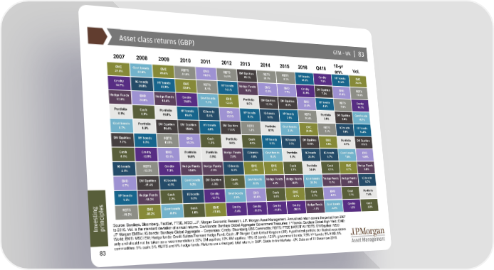 Asset class returns (GBP) GTM–UK | 83 2007 2008 2009 2010 2011 2012 2013 2014 2015 2016 Q416 10-yr Vol. ann. EME Govt bonds EME REITS EMD REITS DM Equities REITS REITS HY bonds Cmdty HY bonds EME 37.5% 52.6% 59.4% 31.6% 10.0% 14.9% 25.0% 35.1% 8.2% 36.3% 7.8% 12.4% 26.8% Cmdty IG bonds HY bonds EME REITS HY bonds Hedge Funds EMD EMD Cmdty DM Equities EMD REITS 14.7% 26.5% 41.9% 22.9% 8.1% 14.4% 9.6% 12.8% 7.7% 32.9% 7.2% 11.6% 17.3% Hedge Funds EMD Hedge Funds Cmdty Govt bonds EME Portfolio DM Equities DM Equities EMD HY bonds REITS Cmdty 12.6% 25.0% 18.4% 20.5% 7.1% 13.4% 6.0% 12.1% 5.5% 30.8% 4.9% 9.6% 16.7% Portfolio Cash Portfolio HY bonds IG bonds EMD HY bonds IG bonds HY bonds REITS Portfolio DM Equities Govt bonds 8.9% 6.9% 16.5% 18.4% 5.1% 12.9% 5.3% 9.6% 2.9% 30.4% 2.6% 9.0% 16.7% Govt bonds Portfolio DM Equities DM Equities HY bonds DM Equities REITS Portfolio Govt bonds EME REITS IG bonds HY bonds 8.7% 1.3% 16.4% 15.9% 3.9% 11.4% 1.3% 8.7% 2.3% 29.5% 2.1% 8.9% 14.0% DM Equities HY bonds REITS EMD Cash Portfolio Cash HY bonds IG bonds DM Equities EME Portfolio DM Equities 7.7% 1.2% 13.5% 15.3% 1.2% 8.0% 0.5% 6.2% 2.0% 25.6% 0.8% 8.7% 12.4% Cash Cmdty EMD Portfolio Portfolio Hedge Funds IG bonds Govt bonds Portfolio IG bonds IG bonds Govt bonds EMD 6.1% -12.5% 12.1% 14.9% -0.9% 7.5% -1.5% 5.4% 1.3% 24.4% 0.7% 7.8% 10.5% IG bonds REITS Cmdty Hedge Funds Hedge Funds IG bonds EME EME Cash Portfolio Cash EME Hedge Funds 4.9% -13.2% 7.3% 10.6% -2.9% 6.3% -4.1% 4.3% 0.7% 24.4% 0.1% 6.7% 9.8% EMD DM Equities IG bonds Govt bonds DM Equities Cash Govt bonds Hedge Funds Hedge Funds Govt bonds Hedge Funds Hedge Funds IG bonds 4.7% -17.4% 6.1% 9.2% -4.3% 1.4% -6.1% 4.1% -0.8% 21.3% 0.1% 3.5% 8.7% HY bonds Hedge Funds Cash IG bonds Cmdty Govt bonds EMD Cash EME Cash EMD Cash Portfolio 1.4% -18.3% 2.2% 9.2% -12.7% -2.6% -10.0% 0.6% -9.7% 0.7% -0.5% 2.1% 7.4% REITS EME Govt bonds Cash EME Cmdty Cmdty Cmdty Cmdty Hedge Funds Govt bonds Cmdty Cash sting -19.2% -35.2% -8.6% 1.0% -17.6% -5.4% -11.2% -11.8% -20.3% -1.1% -4.6% -1.2% 2.2% e v Source: Barclays, Bloomberg, FactSet, FTSE, MSCI, J.P. Morgan Economic Research, J.P. Morgan Asset Management. Annualised return covers the period from 2007 In principlesto 2016. Vol. is the standard deviation of annual returns. Govt bonds: Barclays Global Aggregate Government Treasuries; HY bonds: Barclays Global High Yield; EMD: JP Morgan EMBI+; IG bonds: Barclays Global Aggregate – Corporates; Cmdty: Bloomberg UBS Commodity; REITS: FTSE NAREIT All REITS; DM Equities: MSCI World; EME: MSCI EM; Hedge funds: Credit Suisse/Tremont Hedge Fund; Cash: JP Morgan Cash United Kingdom (3M). Hypothetical portfolio (for illustrative purposes only and should not be taken as a recommendation): 30% DM equities; 10% EM equities; 15% IG bonds; 12.5% government bonds; 7.5% HY bonds; 5% EMD; 5% commodities; 5% cash; 5% REITS and 5% hedge funds. Returns are unhedged, total return, in GBP. Guide to the Markets - UK. Data as of 31 December 2016. 83