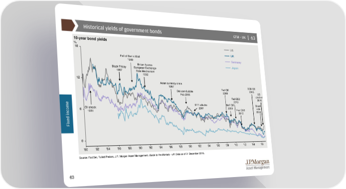 Historical yields of government bonds GTM –UK | 63 10-year bond yields % US 18 UK Fall of Berlin Wall Germany 1989 Black Friday Britain leaves Japan 1987 European Exchange Rate Mechanism 1992 12 Asian currency crisis 1997 Fed QE ECB QE Dot com bubble 2008 2015 US Feb 2000 election Fed QE2 2016 e 2010 m Oil shock 9/11 attacks BoE QE Brexit o 6 2001 2009 Fed QE3 vote c 1981 2016 n 2012 i d e x Fi 0 '80 '82 '84 '86 '88 '90 '92 '94 '96 '98 '00 '02 '04 '06 '08 '10 '12 '14 '16 Source: FactSet, Tullett Prebon, J.P. Morgan Asset Management. Guide to the Markets - UK. Data as of 31 December 2016. 63