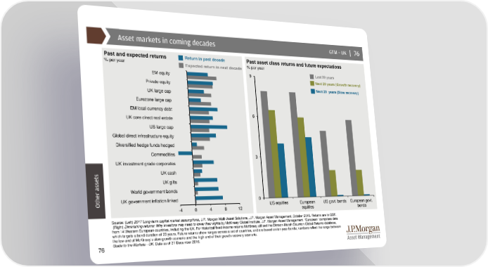 Asset markets in coming decades GTM –UK | 76 Past and expected returns Return in past decade Past asset class returns and future expectations % per year Expected return in next decade % per year EM equity 9 Last 30 years Next 20 years (Growth recovery) Private equity Next 20 years (Slow recovery) UK large cap Eurozone large cap EM local currency debt UK core direct real estate 6 US large cap Global direct infrastructure equity Diversified hedge funds hedged Commodities 3 UK investment grade corporates UK cash UK gilts World government bonds Other assetsUK government inflation linked 0 -404812 US equities European US govt. bonds European govt. equities bonds Source: (Left) 2017 Long-term capital market assumptions, J.P. Morgan Multi-Asset Solutions, J.P. Morgan Asset Management, October 2016. Returns are in GBP. (Right) Diminishing returns: Why investors may need to lower their sights by McKinsey Global Institute, J.P. Morgan Asset Management. “European” comprises data from 14 Western European countries, including the UK. For historical fixed-income returns McKinsey utilised the Dimson-Marsh-Staunton Global Returns database, which targets a bond duration of 20 years. Future returns show ranges across a set of countries, and are based on ten-year bonds; numbers reflect the range between the low-end of McKinsey’s slow-growth scenario and the high end of their growth-recovery scenario. Guide to the Markets - UK. Data as of 31 December 2016. 76