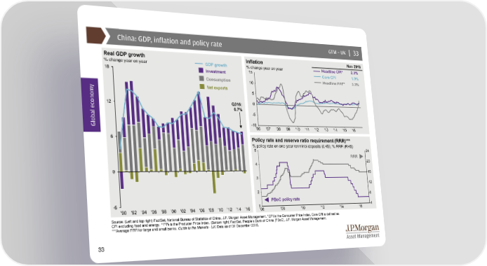 China: GDP, inflation and policy rate GTM –UK | 33 Real GDP growth Inflation Nov 2016 % change year on year GDP growth % change year on year Headline CPI* 2.3% 18 Investment CoreCPI 1.9% Consumption Headline PPI** 3.3% y Net exports 12 Q316: 6.7% Global econom 6 Policy rate and reserve ratio requirement (RRR)*** % policy rate on one-year renminbi deposits (LHS); % RRR (RHS) RRR 0 -6 PBoC policy rate '90 '92 '94 '96 '98 '00 '02 '04 '06 '08 '10 '12 '14 '16 Source: (Left and top right) FactSet, National Bureau of Statistics of China, J.P. Morgan Asset Management. *CPI is the Consumer Price Index. Core CPI is defined as CPI excluding food and energy. **PPI is the Producer Price Index. (Bottom right) FactSet, People’s Bank of China (PBoC), J.P. Morgan Asset Management. ***Average RRR for large and small banks. Guide to the Markets - UK. Data as of 31 December 2016. 33