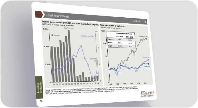 Cash investments GTM –UK | 78 Income generated by £100,000 in a three-month bank deposit Total return of £1 in real terms GBP (LHS); % change year on year (RHS) GBP, log scale for total returns 6,000 2007: £6,000 6 1,000 Annualisedreal returns 1899–2015 2000–2016 Equities: £340 Income Inflation (y/y) Equities 5.1% 1.0% 100 Bonds 1.5% 3.1% Cash 0.8% -0.3% 4,000 4 10 Bonds: £6 Dec 2016: £610 2,000 2 Cash: £3 1 0 0 0 sting '01 '02 '03 '04 '05 '06 '07 '08 '09 '10 '11 '12 '13 '14 '15 '16 1899 1919 1939 1959 1979 1999 e v Source: (Left) Bloomberg, ONS, J.P. Morgan Asset Management. (Right) Dimson, Marsh and Staunton ABN AMRO/LBS Global Investment Returns Yearbook 2008, In principlesFactSet, J.P. Morgan Asset Management. J.P. Morgan estimates from 2008. Equities: FTSE 100; Bonds: JPMorgan GBP Government Bond Index; Cash: three-month GBP Libor (prior to 2008 cash is short dated Treasury bills). Guide to the Markets - UK. Data as of 31 December 2016. 78