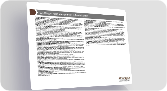 J.P. Morgan Asset Management: Index definitions The Dow Jones Industrial Averagemeasures the stock performance of 30 leading blue-chip U.S. companies The CS/Tremont Equity Market Neutral Index takes both long and short positions in stocks with the aim of minimizing The Dow Jones-UBS Commodity Index is composed of futures contracts on physical commodities and represents twenty exposure to the systematic risk of the market (i.e. a beta of zero).* two separate commodities traded on U.S. exchanges, with the exception of aluminum, nickel, and zinc. The CS/Tremont Multi-Strategy Index consists of funds that allocate capital based on perceived opportunities among West Texas Intermediate (WTI) is underlying commodity in the New York Mercantile Exchange's oil futures contracts. several hedge fund strategies. Strategies adopted in a multi-strategy fund may include, but are not limited to, convertible The S&P GSCI Index is a composite index of commodity sector returns representing an unleveraged, long-only investment bond arbitrage, equity long/short, statistical arbitrage and merger arbitrage. in commodity futures that is broadly diversified across the spectrum of commodities. The returns are calculated on a fully The Barclays U.S. Dollar Floating Rate Note (FRN) Index provides a measure of the U.S. dollar denominated floating rate collateralized basis with full reinvestment. note market. The Barclays U.S. Aggregate Index represents securities that are SEC-registered, taxable, and dollar denominated. The *Market Neutral returns for November 2008 are estimates by J.P. Morgan Funds Market Strategy, and are based on a index covers the U.S. investment grade fixed rate bond market, with index components for government and corporate December 8, 2008 published estimate for November returns by CS/Tremont in which the Market Neutral returns were securities, mortgage pass-through securities, and asset-backed securities. estimated to be +0.85% (with 69% of all CS/Tremont constituents having reported return data). Presumed to be excluded This U.S. Treasury Index is a component of the U.S. Government index. from the November return are three funds, which were later marked to $0 by CS/Tremont in connection with the Bernard The Barclays High Yield Index covers the universe of fixed rate, non-investment grade debt. Pay-in-kind (PIK) bonds, Madoff scandal. J.P. Morgan Funds believes this distortion is not an accurate representation of returns in the category. Eurobonds, and debt issues from countries designated as emerging markets (e.g., Argentina, Brazil, Venezuela, etc.) are CS/Tremont later published a finalized November return of -40.56% for the month, reflecting this mark-down. CS/Tremont excluded, but Canadian and global bonds (SEC registered) of issuers in non-EMG countries are included. assumes no responsibility for these estimates. The Barclays 1-3 Month U.S. Treasury Bill Index includes all publicly issued zero-coupon U.S. Treasury Bills that have a remaining maturity of less than 3 months and more than 1 month, are rated investment grade, and have $250 million or The Office of National Statistics (ONS) Index is a mix-adjusted average housing price index. The index is calculated more of outstanding face value. monthly using mortgage financed transactions from the Regulated Mortgage Survey by the Council of Mortgage Lenders. The Barclays Euro-Aggregate Index consists of bond issued in the euro or the legacy currencies of the sovereign countries The Nationwide House Price Index is a mix adjusted index constructed from Nationwide lending data across the UK. participating the European Monetary Union (EMU). The Halifax House Price Index is constructed from mortgage data derived from Halifax lending data across the UK. The Global Bond Index Emerging Market Broad Diversified Index (GBI-EM) is a comprehensive global local emerging The MSCI AC World High Dividend Yield Index is composed of those securities that have higher-than-average dividend markets index, and consists of liquid, fixed-rate, domestic currency government bonds. yield within its parent index, a track record of consistent dividend payments and the capacity to sustain future dividend The Barclays Global Aggregate Corporate Index consists of corporate issues in Europe, the US and Asia-pacific regions. payments. TheBarclays Global High Yield Index is an unmanaged index considered representative of fixed rate, noninvestment- grade debt of companies in the U.S., developed markets and emerging markets. The Barclays Emerging Markets Index includes USD-denominated debt from emerging markets in the following regions: Americas, Europe, Middle East, Africa, and Asia. As with other fixed income benchmarks provided by Barclays Capital, the index is rules-based, which allows for an unbiased view of the marketplace and easy replicability. The Barclays MBS Index covers the mortgage-backed pass-through securities of Ginnie Mae, Fannie Mae, and Freddie Mac. Aggregate components must have a weighted average maturity of at least one year, must have $250 million par amount outstanding, and must be fixed rate mortgages. The Barclays Corporate Bond Index is the Corporate component of the U.S. Credit index. The Barclays TIPS Index consists of Inflation-Protection securities issued by the U.S. Treasury. The J.P. Morgan EMBI Global Index includes U.S. dollar denominated Brady bonds, Eurobonds, traded loans and local market debt instruments issued by sovereign and quasi-sovereign entities. The Li Keqiang Index is a composite measure composed of China’s electricity production, financial institution loans and railway freight. The Euro Stoxx 600 Index represents large, mid and small capitalisation companies across 18 European countries. The JPMorgan GBI-EM Global Diversified consists of regularly traded, liquid fixed-rate, domestic currency government bonds to which international investors can gain exposure. The weightings among the countries are more evenly distributed wit