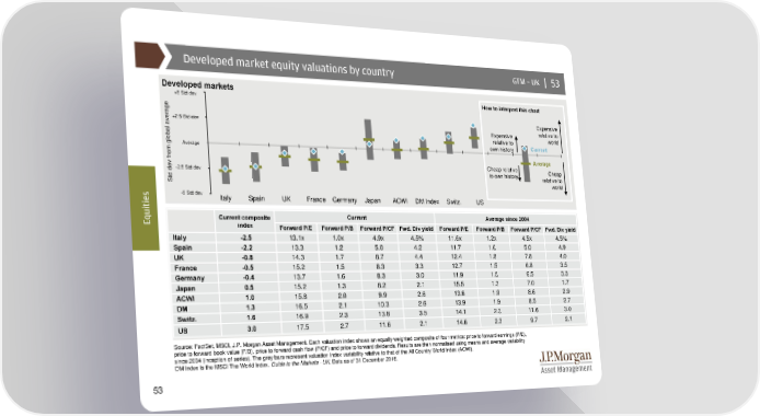 Developed market equity valuations by country GTM –UK | 53 Developed markets How to interpret this chart +5 Std dev +2.5 Std dev Expensive Expensive relative to relative to world global average own history Current Average Average Cheap relative Cheap -2.5 Std dev to own history relative to Std dev from world s -5 Std dev Italy Spain UK France Germany Japan ACWI DM Index Switz. US e i t i u Current Average since 2004 Eq Current composite index Forward P/E Forward P/B Forward P/CF Fwd. Divyield Forward P/E Forward P/B Forward P/CF Fwd. Divyield Italy -2.5 13.1x 1.0x 4.9x 4.5% 11.6x 1.2x 4.5x 4.5% Spain -2.2 13.3 1.2 5.0 4.2 11.7 1.6 5.0 4.9 UK -0.8 14.3 1.7 8.7 4.4 12.4 1.8 7.8 4.0 France -0.5 15.2 1.5 8.3 3.3 12.7 1.5 6.8 3.5 Germany -0.4 13.7 1.6 8.3 3.0 11.9 1.5 6.5 3.3 Japan 0.5 15.2 1.3 8.2 2.1 15.5 1.3 7.0 1.7 ACWI 1.0 15.8 2.0 9.9 2.6 13.6 1.9 8.6 2.9 DM 1.3 16.5 2.1 10.3 2.6 13.9 1.9 8.5 2.7 Switz. 1.6 16.9 2.3 13.8 3.5 14.1 2.3 11.6 3.0 US 3.0 17.5 2.7 11.6 2.1 14.6 2.3 9.7 2.1 Source: FactSet, MSCI, J.P. Morgan Asset Management. Each valuation index shows an equally weighted composite of four metrics: price to forward earnings (P/E), price to forward book value (P/B), price to forward cash flow (P/CF) and price to forward dividends. Results are then normalised using means and average variability since 2004 (inception of series). The grey bars represent valuation index variability relative to that of the All Country World Index (ACWI). DM Index is the MSCI The World Index. Guide to the Markets - UK. Data as of 31 December 2016. 53