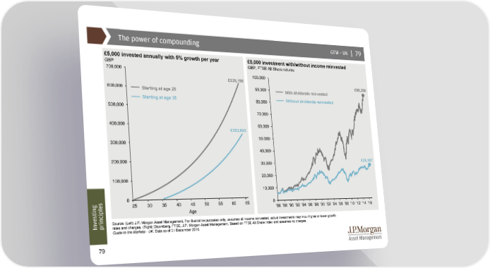 The power of compounding GTM –UK | 79 £5,000 invested annually with 5% growth per year £5,000 investment with/without income reinvested GBP GBP, FTSE All-Share returns 700,000 100,000 £639,199 £88,396 600,000 Starting at age 25 90,000 With dividends reinvested Starting at age 35 80,000 Without dividends reinvested 500,000 70,000 400,000 60,000 £353,803 50,000 300,000 40,000 200,000 30,000 £28,357 100,000 20,000 10,000 0 0 25 30 35 40 45 50 55 60 65 '86 '88 '90 '92 '94 '96 '98 '00 '02 '04 '06 '08 '10 '12 '14 '16 sting Age e v Source: (Left) J.P. Morgan Asset Management. For illustrative purposes only, assumes all income reinvested, actual investments may incur higher or lower growth Inprinciplesrates and charges. (Right) Bloomberg, FTSE, J.P. Morgan Asset Management. Based on FTSE All-Share index and assumes no charges. Guide to the Markets - UK. Data as of 31 December 2016. 79
