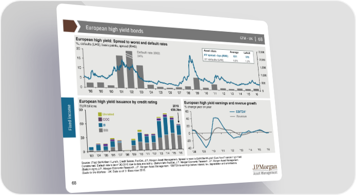 European high yield bonds GTM –UK | 68 European high yield: Spread to worst and default rates 2,500 %, defaults (LHS); basis points, spread (RHS) Asset class Average Latest 20 Default rate 2002: HY spread - bps (RHS) 631 370 2,000 34% HY defaults (LHS) 4.8% 1.2% 15 1,500 10 1,000 5 500 0 0 '98 '99 '00 '01 '02 '03 '04 '05 '06 '07 '08 '09 '10 '11 '12 '13 '14 '15 16 European high yield issuance by credit rating European high yield earnings and revenue growth e EUR billions 2016 % change year on year m 90 €58.3bn 60 EBITDA* o c Unrated n Revenue i CCC 40 d e 60 B x 20 Fi BB 30 0 -20 0 -40 '03 '04 '05 '06 '07 '08 '09 '10 '11 '12 '13 '14 '15 '16 '08 '09 '10 '11 '12 '13 '14 '15 '16 Source: (Top) BofA/Merrill Lynch, Credit Suisse, FactSet, J.P. Morgan Asset Management. Spread to worst is BofA/Merrill Lynch Euro Non-Financial High Yield Constrained. Default rate is as of 3Q 2016 due to data availability. (Bottom left) FactSet, J.P. Morgan Economic Research, J.P. Morgan Asset Management. (Bottom right) J.P. Morgan Economic Research, J.P. Morgan Asset Management. *EBITDA is earnings before interest, tax, depreciation and amortisation. Guide to the Markets - UK. Data as of 31 December 2016. 68