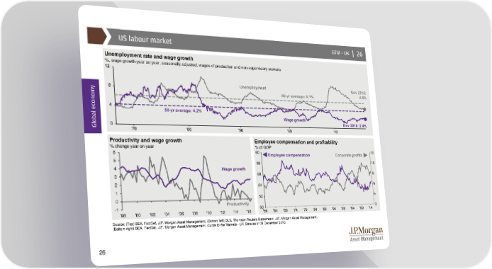 US labour market GTM –UK | 26 Unemployment rate and wage growth %, wage growth year on year, seasonally adjusted, wages of production and non-supervisory workers y Unemployment Nov 2016: 50-yr average: 6.1% 4.6% 50-yr average: 4.2% Wage growth Global econom Nov 2016: 2.4% Productivity and wage growth Employee compensation and profitability % change year on year % of GDP 6 Employee compensation Corporate profits 5 4 Wage growth 3 2 1 0 -1 Productivity '98 '00 '02 '04 '06 '08 '10 '12 '14 '16 Source: (Top) BEA, FactSet, J.P. Morgan Asset Management. (Bottom left) BLS, Thomson Reuters Datastream, J.P. Morgan Asset Management. (Bottom right) BEA, FactSet, J.P. Morgan Asset Management. Guide to the Markets - UK. Data as of 31 December 2016. 26