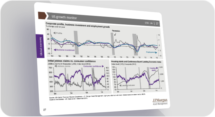 US growth monitor GTM –UK | 27 Corporate profits, business investment and employment growth % change year on year Recession 60 12 40 Profits y 7 20 2 0 -20 -3 Business investment Employment Global econom-40 -8 '84 '86 '88 '90 '92 '94 '96 '98 '00 '02 '04 '06 '08 '10 '12 '14 '16 Initial jobless claims vs. consumer confidence Housing starts and Conference Board Leading Economic Index Jobless claims in thousands (LHS); index level (RHS) Index level (LHS); thousands (RHS) 700 Jobless claims Consumer confidence 160 140 Housing 3,000 140 130 starts 600 120 120 500 100 110 2,000 80 100 400 60 90 40 80 1,000 300 70 Leading indicator 20 60 200 0 50 0 '84 '94 '04 '14 '84 '94 '04 '14 Source: (All charts) Thomson Reuters Datastream, J.P. Morgan Asset Management. Light grey columns in all charts indicate recessions determined by NBER. Guide to the Markets - UK. Data as of 31 December 2016. 27