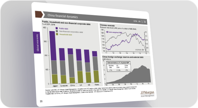 China financial dynamics GTM –UK | 35 Public, household and non-financial corporate debt Chinese renminbi % of GDP, Q216 Rebased index level (LHS); price of a dollar in RMB (RHS) 400 Public debt Trade-weightedRMB Non-financial corporation debt y Household debt 300 Global econom USD/RMB 200 China foreign exchange reserves and external debt USD trillions External debt as a % of global GDP EM Asia US China 100 1998 2008 2014 1.7% 21.8% 1.2% 0 Japan Eurozone China UK US Korea Source: (Left) BIS, J.P. Morgan Asset Management. Household and NFC debt is market value. Government debt is gross and nominal value, except for Korea which is market value due to data limitations. All series adjusted for breaks by the BIS. (Top right) BIS, FactSet, J.P. Morgan Asset Management. (Bottom right) FactSet, People’s Bank of China, J.P. Morgan Asset Management. Guide to the Markets - UK. Data as of 31 December 2016. 35