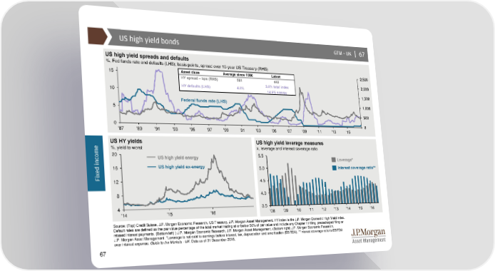 US high yield bonds GTM –UK | 67 US high yield spreads and defaults %, Fed funds rate and defaults (LHS); basis points, spread over 10-year US Treasury (RHS) 15 Asset class Average since 1986 Latest 2,500 HY spread – bps (RHS) 561 449 2,000 HY defaults (LHS) 4.0% 3.6% total index 10 14.6% energy 1,500 Federal funds rate (LHS) 1,000 5 500 0 0 '87 '89 '91 '93 '95 '97 '99 '01 '03 '05 '07 '09 '11 '13 '15 e US HY yields US high yield leverage measures m %, yield to worst x, leverage and interest coverage ratio o 20 US high yield energy 5.5 c Leverage* n i 16 US high yield ex-energy d 5.0 Interest coverage ratio** e x Fi 12 4.5 8 4.0 4 3.5 '14 '15 '16 '08 '09 '10 '11 '12 '13 '14 '15 '16 Source: (Top) Credit Suisse, J.P. Morgan Economic Research, US Treasury, J.P. Morgan Asset Management. HY index is the J.P. Morgan Domestic High Yield index. Default rates are defined as the par value percentage of the total market trading at or below 50% of par value and include any Chapter 11 filing, prepackaged filing or missed interest payments. (Bottom left) ) J.P. Morgan Economic Research, J.P. Morgan Asset Management. (Bottom right) J.P. Morgan Economic Research, J.P. Morgan Asset Management. *Leverage is net debt to earnings before interest, tax, depreciation and amortisation (EBITDA). **Interest coverage ratio is EBITDA over interest expense. Guide to the Markets - UK. Data as of 31 December 2016. 67