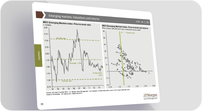 Emerging markets: Valuations and returns GTM –UK | 55 MSCI Emerging Markets Index: Price-to-book ratio MSCI Emerging Markets Index: Price-to-book and returns x, multiple Price-to-book ratio and next 5-year annualised % price return* 3.00 60 Current level 2.75 50 +2.0 std. dev. 2.50 40 2.25 s 30 e 2.00 i t i u 20 Eq 1.75 Average: 1.79x 10 1.50 1.25 31 Dec 2016: 0 1.51x 1.00 -10 -2.0 std. dev. 0.75 -20 '97 '99 '01 '03 '05 '07 '09 '11 '13 '15 0.75 1.25 1.75 2.25 2.75 3.25 Source: (All charts) FactSet, MSCI, J.P. Morgan Asset Management. *Dots represent monthly data points January 1997 through December 2016. Guide to the Markets - UK. Data as of 31 December 2016. 55