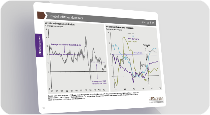 Global inflation dynamics GTM –UK | 11 Developed economy inflation Headline inflation and forecasts % change year on year % change year on year 5 4 US UK y Eurozone 4 Japan 3 Forecasts* 3 Average Jan 1993 to Dec 2008: 2.0% Policy target Global econom2 2 1 1 0 0 -1 Average Jan 2009 to Nov 2016: 1.2% -2 -1 '93 '95 '97 '99 '01 '03 '05 '07 '09 '11 '13 '15 '13 '14 '15 '16 '17 '18 Source: (Left) Haver Analytics, J.P. Morgan Asset Management. (Right) BLS, Eurostat, J.P. Morgan Economic Research, Ministry of Internal Affairs and Communications, ONS, Thomson Reuters Datastream, J.P. Morgan Asset Management. *Inflation forecasts are from J.P. Morgan Economic Research. Guide to the Markets - UK. Data as of 31 December 2016. 11