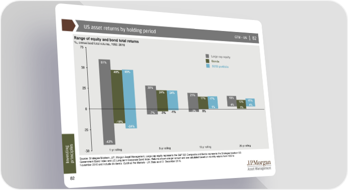 US asset returns by holding period GTM –UK | 82 Range of equity and bond total returns %, annualised total returns, 1950-2016 75 Large cap equity Bonds 61% 50/50 portfolio 50 49% 48% 25 30% 24% 24% 21% 17% 17% 18% 15% 4% 13% 4% 0 1% 1% -7% -3% -1% -3% 0% -18% -25 -24% -43% sting -50 1-yr rolling 5-yr rolling 10-yr rolling 20-yr rolling e v Source: Strategas/Ibbotson, J.P. Morgan Asset Management. Large cap equity represents the S&P 500 Composite and Bonds represents the Strategas/Ibbotson US In principlesGovernment Bond Index and US Long-term Corporate Bond Index. Returns shown are per annum and are calculated based on monthly returns from 1950 to November 2016 and include dividends. Guide to the Markets - UK. Data as of 31 December 2016. 82