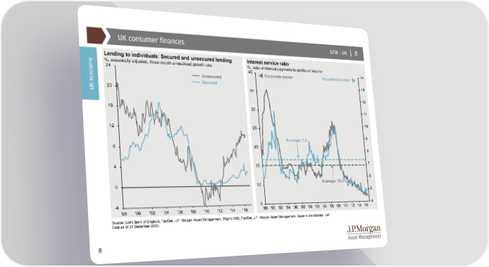 UK consumer finances GTM –UK | 8 y Lending to individuals: Secured and unsecured lending Interest service ratio %, seasonally adjusted, three-month annualised growth rate %, ratio of interest payments to profits or income 40 Corporate sector Household sector 14 Unsecured Secured 13 UK econom 35 12 30 11 25 10 Average: 7.4 9 20 8 15 7 6 10 Average: 15.2 5 5 4 '88 '90 '92 '94 '96 '98 '00 '02 '04 '06 '08 '10 '12 '14 '16 Source: (Left) Bank of England, FactSet, J.P. Morgan Asset Management. (Right) ONS, FactSet, J.P. Morgan Asset Management. Guide to the Markets - UK. Data as of 31 December 2016. 8