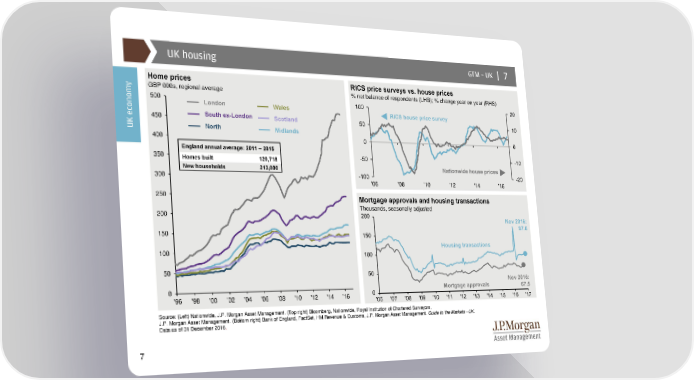 UK housing GTM –UK | 7 y Home prices RICS price surveys vs. house prices GBP 000s, regional average % net balance of respondents (LHS); % change year on year (RHS) 500 London Wales 100 20 South ex-London RICS house price survey 450 Scotland 50 10 UK econom North Midlands 400 0 0 England annual average: 2011 – 2015 350 Homes built 120,718 -50 -10 New households 213,000 Nationwide house prices 300 -100 -20 '06 '08 '10 '12 '14 '16 250 Mortgage approvals and housing transactions 200 Thousands, seasonally adjusted Nov 2016: 150 97.6 100 Housing transactions 50 Nov 2016: 0 Mortgage approvals 67.5 '96 '98 '00 '02 '04 '06 '08 '10 '12 '14 '16 Source: (Left) Nationwide, J.P. Morgan Asset Management. (Top right) Bloomberg, Nationwide, Royal Institution of Chartered Surveyors, J.P. Morgan Asset Management. (Bottom right) Bank of England, FactSet, HM Revenue & Customs, J.P. Morgan Asset Management. Guide to the Markets - UK. Data as of 31 December 2016. 7